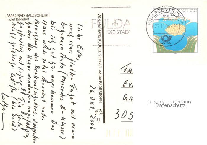 73105553 alte Postkarte Bad Salzschlirf Hotel Badehof postalisch gelaufen Erhaltung siehe scans [WerneD78] KatCode: 11110006631001