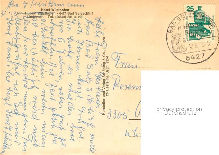 73071406 alte Postkarte Bad Salzschlirf Hotel Wuesthofen postalisch gelaufen Erhaltung siehe scans [NatalD47] KatCode: 11110006631001
