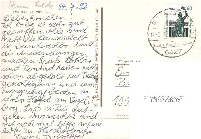 72888348 alte Postkarte Bad Salzschlirf Kurpark Hotel Badehof Brunnenhalle Sole Schwimmbad Mariengrotte Rote Bruecke Musikpavillon postalisch gelaufen Erhaltung siehe scans [FriedD77] KatCode: 11110006631001