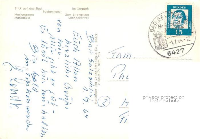 73168966 alte Postkarte Bad Salzschlirf Panorama Kurpark Taubenhaus Mariengrotte Marienlust Erlengrund Sonnenkanzel Wappen postalisch gelaufen Erhaltung siehe scans [FriedD77] KatCode: 11110006631001