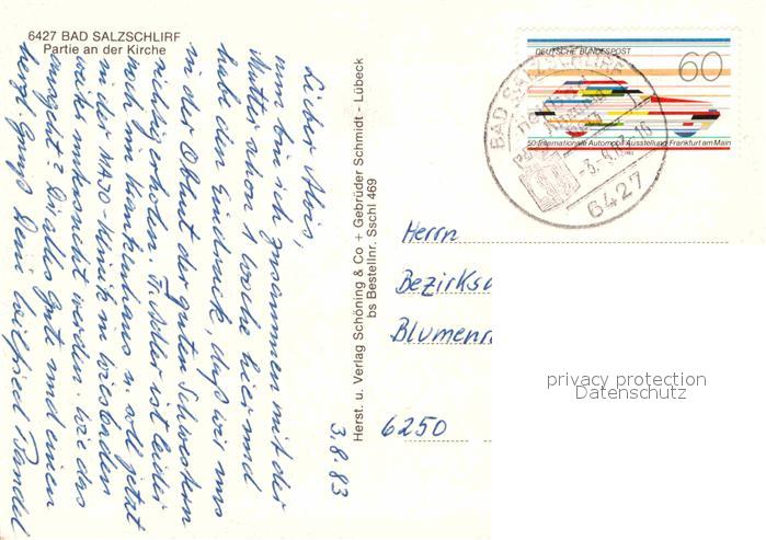 72769143 alte Postkarte Bad Salzschlirf Partie an der Kirche Fachwerkhaeuser postalisch gelaufen Erhaltung siehe scans [FriedD77] KatCode: 11110006631001