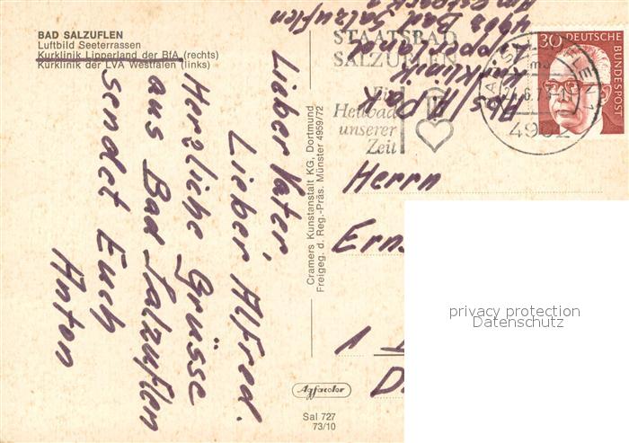 73721425 alte Postkarte Bad Salzuflen Fliegeraufnahme Kurklinik Lipperland der BfA postalisch gelaufen Erhaltung siehe scans [WerneD78] KatCode: 11110005766008
