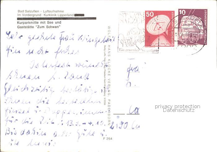 71975700 alte Postkarte Bad Salzuflen Fliegeraufnahme Kurklinik Lipperland Kurparkmitte See Gaststaette Zum Schwan postalisch gelaufen Erhaltung siehe scans KatCode: 11110005766008