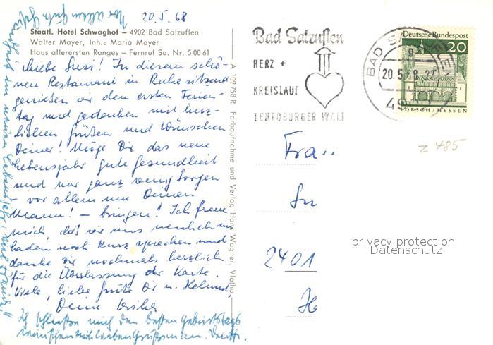 73125269 alte Postkarte Bad Salzuflen Hotel Schwaghof postalisch gelaufen Erhaltung siehe scans [NatalD47] KatCode: 11110005766008