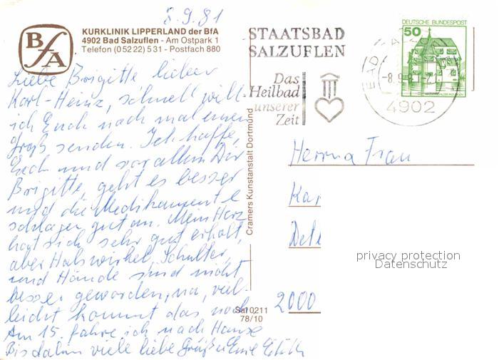 72913971 alte Postkarte Bad Salzuflen Kurklinik Lipperland postalisch gelaufen Erhaltung siehe scans [KathaD81] KatCode: 11110005766008