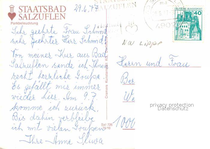 72915531 alte Postkarte Bad Salzuflen Parkbeleuchtung postalisch gelaufen Erhaltung siehe scans [NatalD47] KatCode: 11110005766008
