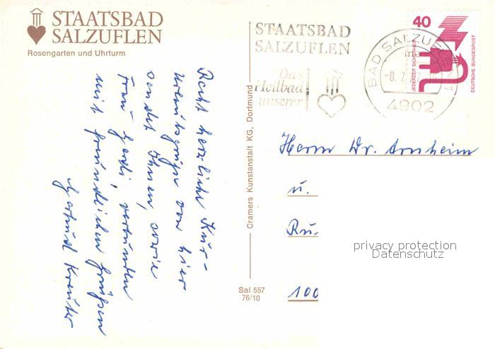 72904830 alte Postkarte Bad Salzuflen Rosengarten Uhrturm postalisch gelaufen Erhaltung siehe scans [AndreD76] KatCode: 11110005766008