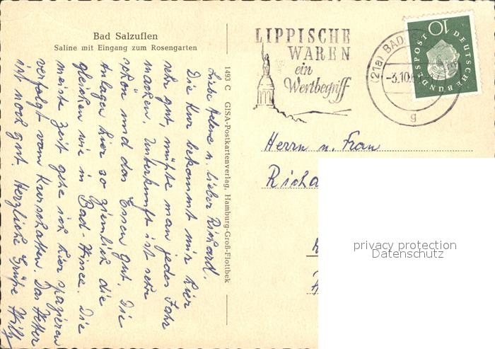 72077362 alte Postkarte Bad Salzuflen Saline mit Eingang zum Rosengarten Thermalbad Springbrunnen postalisch gelaufen Erhaltung siehe scans KatCode: 11110005766008