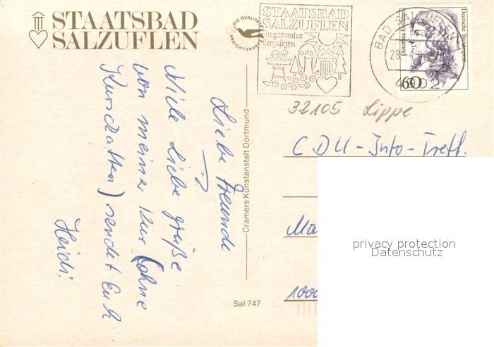 73727234 alte Postkarte Bad Salzuflen Staatsbad Eingang Thermal Hallenbad Kneippgarten Kneippanlage Freibad Sonnenterrasse Fahrrad Ergometer Bewegungsbad Gymnastikhalle postalisch gelaufen Erhaltung siehe scans [WerneD78] KatCode: 11110005766008