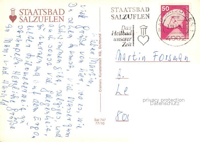 73105575 alte Postkarte Bad Salzuflen Staatsbad Eingang Thermalhallenbad Kneippgarten Thermalsole Freibad Sonnenterrasse Fahrrad Ergometer Bewegungsbad Gymnastik Halle postalisch gelaufen Erhaltung siehe scans [WerneD78] KatCode: 11110005766008