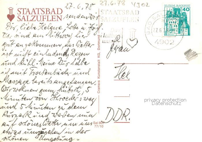 73144899 alte Postkarte Bad Salzuflen Uhrturm Kurparkhotel Kurhaus Leopoldsprudel Wandelhalle Konzerthaus postalisch gelaufen Erhaltung siehe scans [FriedD77] KatCode: 11110005766008