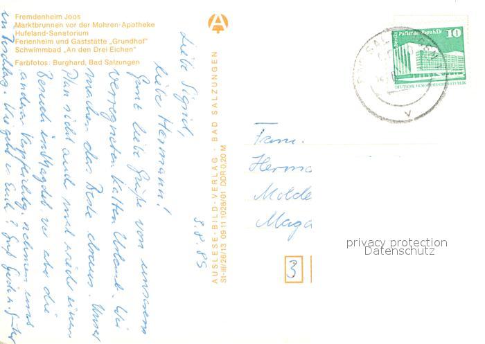 72953546 alte Postkarte Bad Salzungen Fremdenheim Joos Marktbrunnen Hufeland Sanatorium Ferienheim und Gaststaette Grundhof Schwimmbad Drei Eichen postalisch gelaufen Erhaltung siehe scans [WerneD78] KatCode: 11110016063003