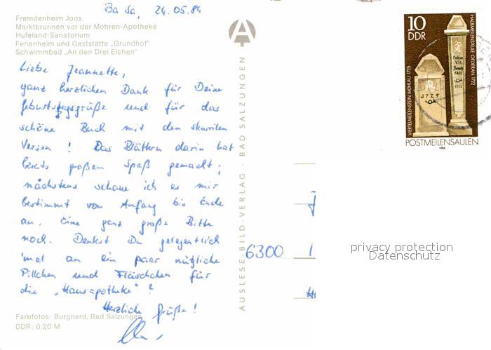 72629359 alte Postkarte Bad Salzungen Fremdenheim Joos Marktbrunnen Hufeland Sanatorium Gaststaette Grundhof Schwimmbad An den Drei Eichen postalisch gelaufen Erhaltung siehe scans [WerneD78] KatCode: 11110016063003