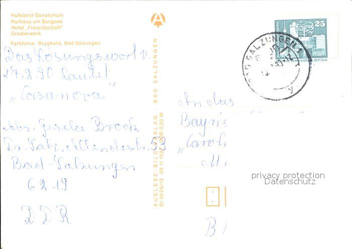 72324647 alte Postkarte Bad Salzungen Hufeland Sanatorium Kurhaus am Burgsee Hotel Freundschaft Gradierwerk postalisch gelaufen Erhaltung siehe scans KatCode: 11110016063003