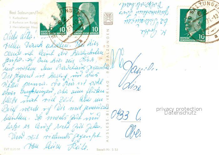 72743253 alte Postkarte Bad Salzungen Kurbuecherei Kurhaus am Burgsee Henneberger Haus Freibad postalisch gelaufen Erhaltung siehe scans [FriedD77] KatCode: 11110016063003