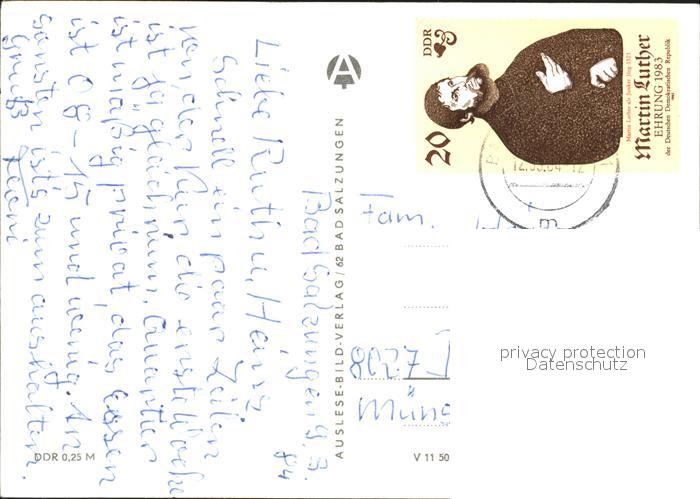 72366524 alte Postkarte Bad Salzungen Kurbuecherei Markt mit Rathaus Henneberger Haus Kurhaus am Burgsee Gradierwerk postalisch gelaufen Erhaltung siehe scans KatCode: 11110016063003