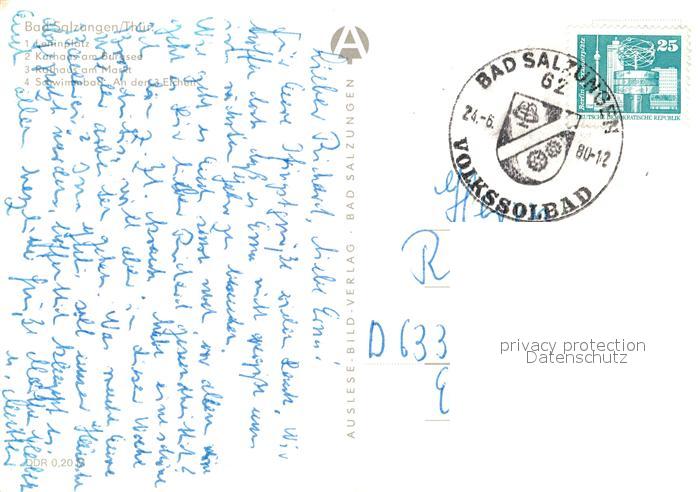 73249142 alte Postkarte Bad Salzungen Leninplatz Kurhaus Burgsee Rathaus Markt Schwimmbad postalisch gelaufen Erhaltung siehe scans [FriedD77] KatCode: 11110016063003