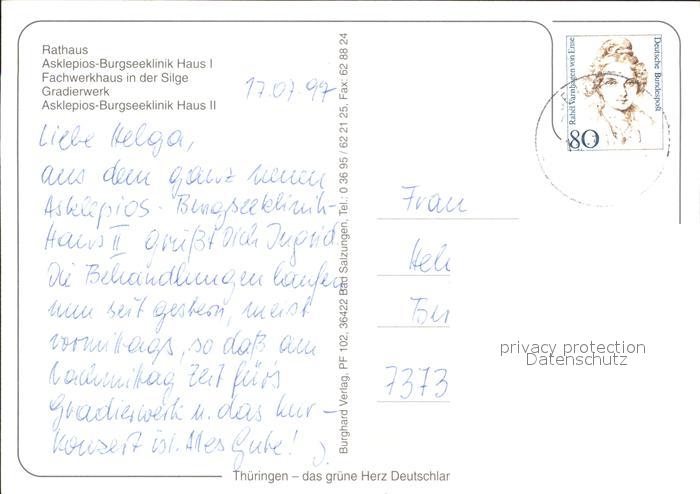 72408342 alte Postkarte Bad Salzungen Rathaus Asklepios Burgseeklinik Haus I und II Fachwerkhaus in der Silge Gradierwerk postalisch gelaufen Erhaltung siehe scans KatCode: 11110016063003