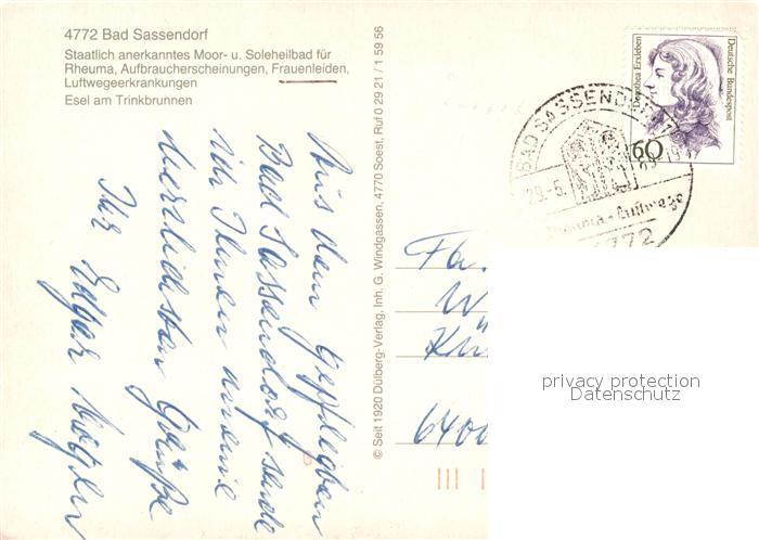 73266026 alte Postkarte Bad Sassendorf Esel am Trinkbrunnen Plastik postalisch gelaufen Erhaltung siehe scans [FriedD77] KatCode: 11110005974008