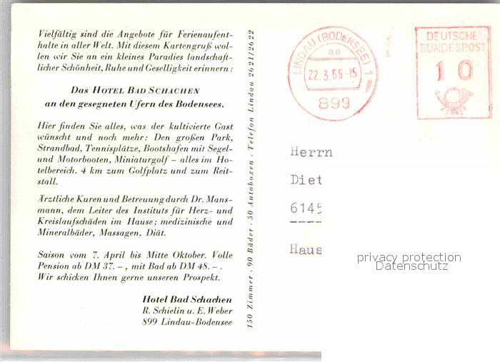 72754028 alte Postkarte Bad Schachen Lindau Hotel am See postalisch gelaufen Erhaltung siehe scans [FriedD77] KatCode: 11110009776116