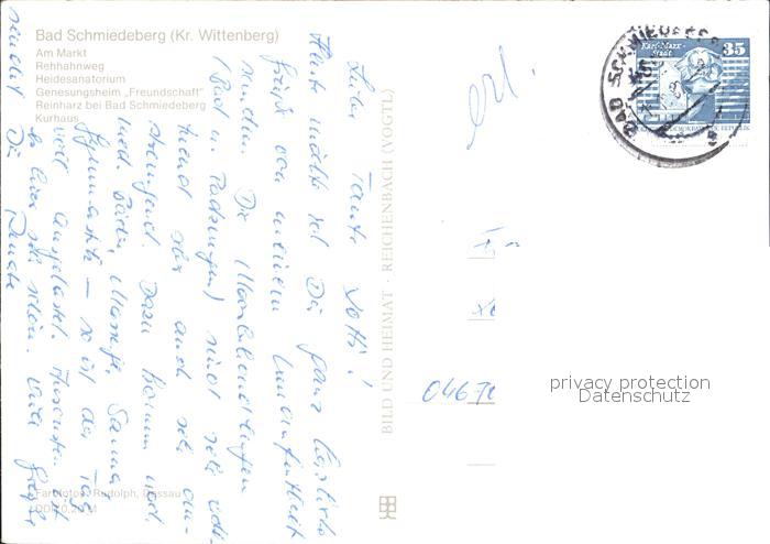72140537 alte Postkarte Bad Schmiedeberg Am Markt Rehhahnweg Heidesanatorium Genesungsheim Freundschaft Reinharz Kurhaus postalisch gelaufen Erhaltung siehe scans KatCode: 11110015091020