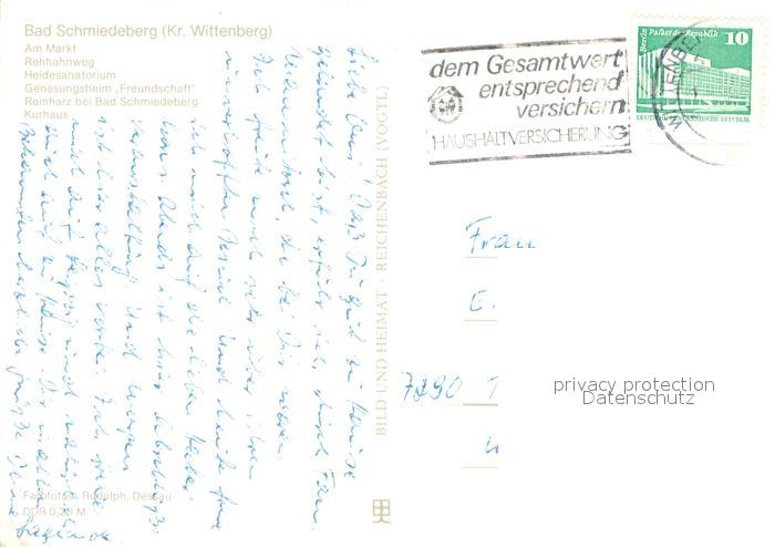 73649754 alte Postkarte Bad Schmiedeberg Markt Rehhahnweg Heidesanatorium Genesungsheim Freundschaft Reinharz Kurhaus postalisch gelaufen Erhaltung siehe scans [FriedD77] KatCode: 11110015091020