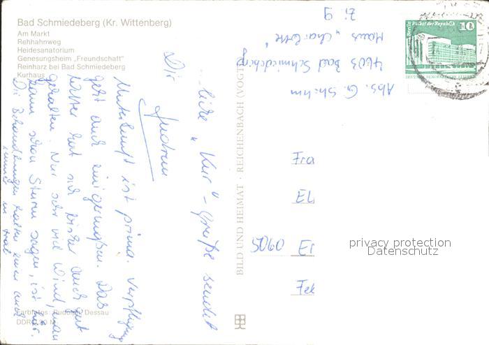 72137368 alte Postkarte Bad Schmiedeberg Markt Rehhahnweg Heidesanatorium Genesungsheim Freundschaft Reinharz Kurhaus postalisch gelaufen Erhaltung siehe scans KatCode: 11110015091020