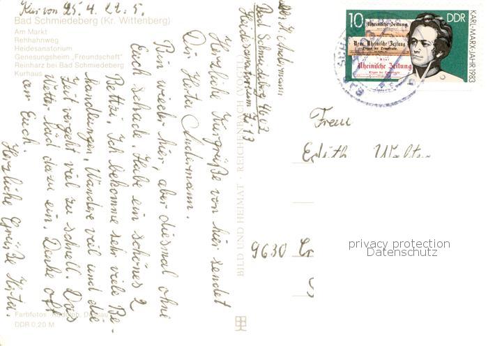 73792669 alte Postkarte Bad Schmiedeberg Markt Rehhahnweg Heidesanatorium Genesungsheim Freundschaft Reinharz Kurhaus postalisch gelaufen Erhaltung siehe scans [FriedD77] KatCode: 11110015091020
