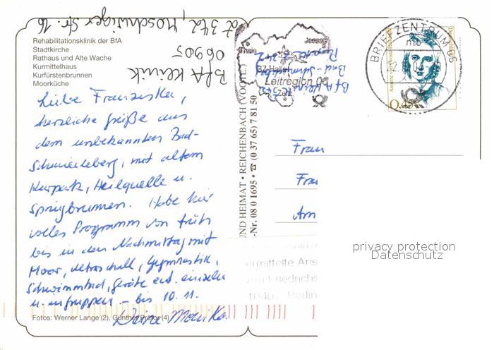 72696518 alte Postkarte Bad Schmiedeberg Rehabilitationsklinik der BfA Stadtkirche Rathaus Alte Wache Kurmittelhaus Kurfuerstenbrunnen Moorkueche postalisch gelaufen Erhaltung siehe scans [FriedD77] KatCode: 11110015091020