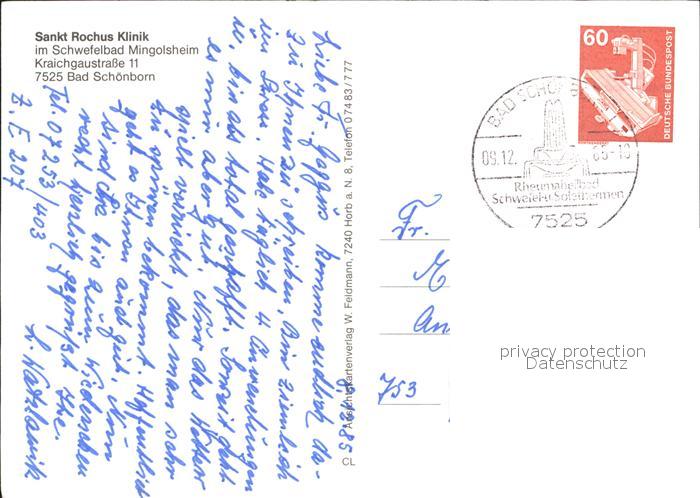 72001973 alte Postkarte Bad Schoenborn Sankt Rochus Klinik Schwefelbad Mingolsheim postalisch gelaufen Erhaltung siehe scans KatCode: 11110008215100