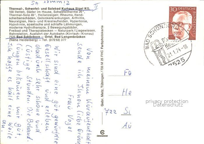72221896 alte Postkarte Bad Schoenborn Thermal- Schwefel- Solebad Kurhaus Sigel KG postalisch gelaufen Erhaltung siehe scans KatCode: 11110008215100