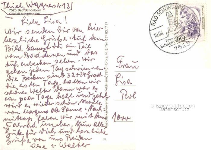 72826188 alte Postkarte Bad Schoenborn Thermarium Mingolsheim postalisch gelaufen Erhaltung siehe scans [NatalD47] KatCode: 11110008215100
