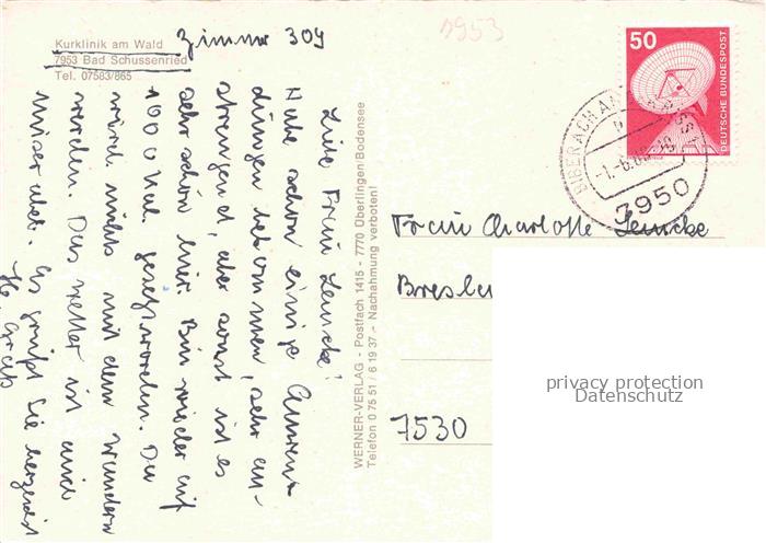 74052584 alte Postkarte Bad Schussenried Kurklinik am Wald Gymnastikraum Kegelbahn Hallenbad Speisesaal postalisch gelaufen Erhaltung siehe scans [FriedD77] KatCode: 11110008426014