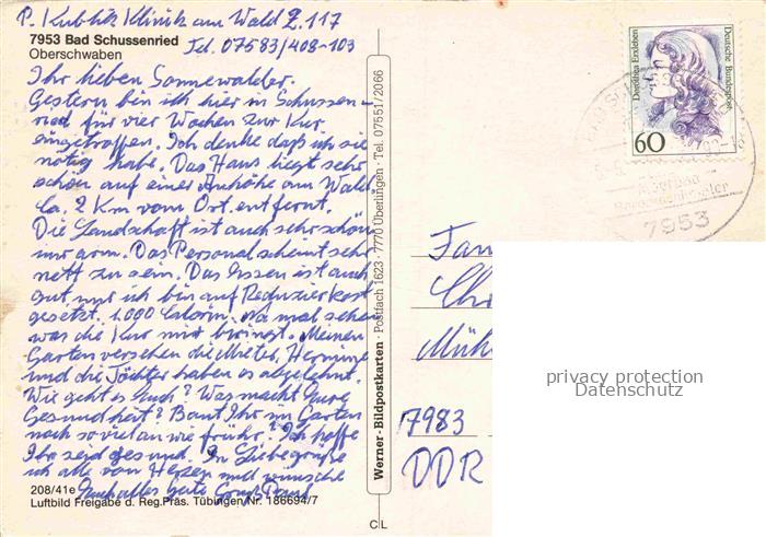 74026341 alte Postkarte Bad Schussenried Panorama Kurort mit Kurklinik postalisch gelaufen Fliegeraufnahme Erhaltung siehe scans [FriedD77] KatCode: 11110008426014
