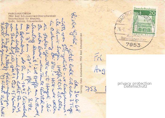 74052576 alte Postkarte Bad Schussenried Parksanatorium Wasserspiele postalisch gelaufen Erhaltung siehe scans [FriedD77] KatCode: 11110008426014