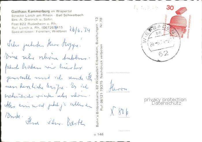72404779 alte Postkarte Bad Schwalbach Gasthaus Kammerburg postalisch gelaufen Erhaltung siehe scans KatCode: 11110006439002