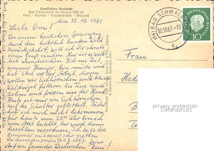 72606162 alte Postkarte Bad Schwalbach Kurhotel postalisch gelaufen Erhaltung siehe scans [AndreD76] KatCode: 11110006439002
