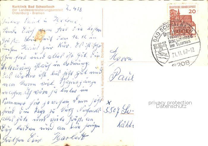 71947338 alte Postkarte Bad Schwalbach Kurklinik der LVA Oldenburg Bremen postalisch gelaufen Erhaltung siehe scans KatCode: 11110006439002