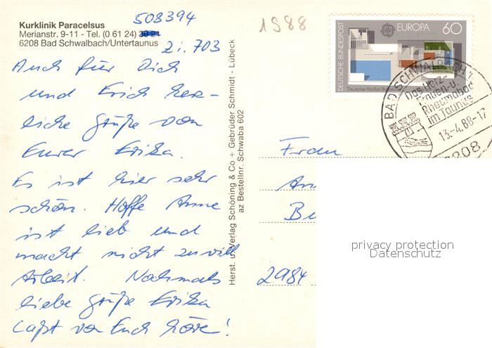 73130260 alte Postkarte Bad Schwalbach Kurklinik Paracelsus postalisch gelaufen Erhaltung siehe scans [PaolaD17] KatCode: 11110006439002