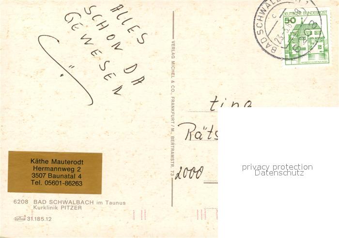 73164995 alte Postkarte Bad Schwalbach Kurklinik Pitzer postalisch gelaufen Erhaltung siehe scans [WerneD78] KatCode: 11110006439002