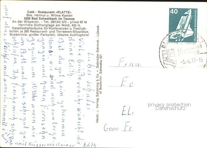 72572585 alte Postkarte Bad Schwalbach Restaurant Cafe Platte postalisch gelaufen Erhaltung siehe scans [LiesaD40] KatCode: 11110006439002