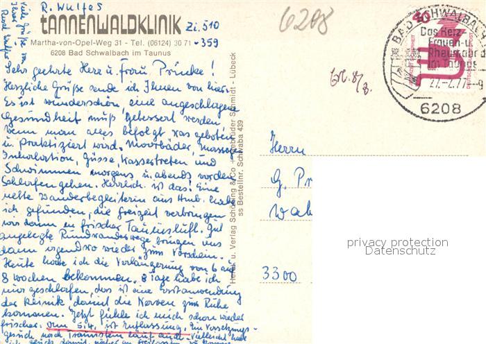 72954384 alte Postkarte Bad Schwalbach Tannenwaldklinik postalisch gelaufen Erhaltung siehe scans [FriedD77] KatCode: 11110006439002