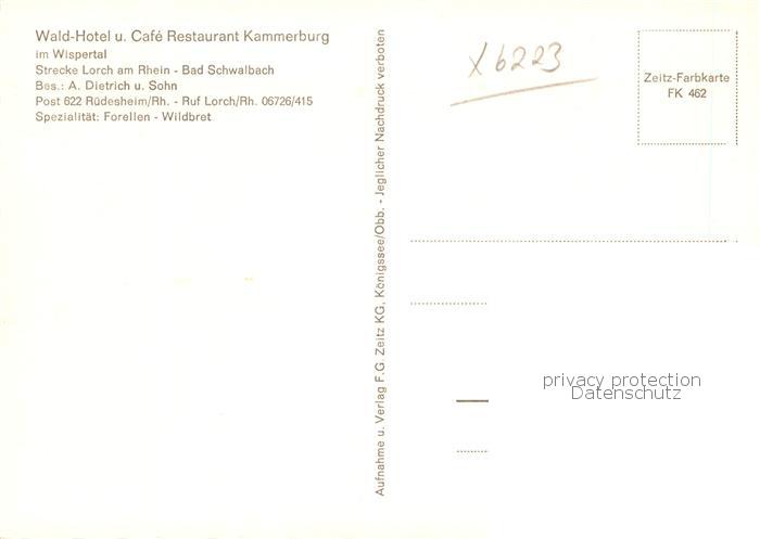 73844871 Bad Schwalbach Wald Hotel Cafe Restaurant Kammerburg im Wispertal postalisch nicht gelaufen Erhaltung siehe scans [FriedD77] KatCode: 11110006439002