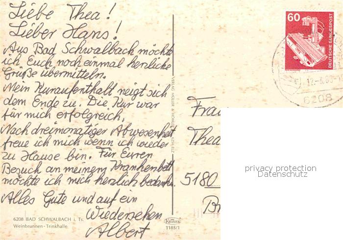 72919088 alte Postkarte Bad Schwalbach Weinbrunnen Trinkhalle postalisch gelaufen Erhaltung siehe scans [LiesaD40] KatCode: 11110006439002