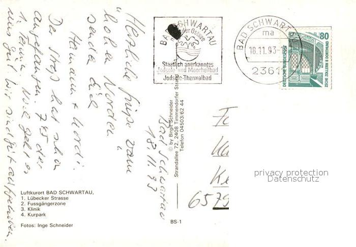 73178451 alte Postkarte Bad Schwartau Strassenpartie Innenstadt Fussgaengerzone Klinik Kurpark Promenade postalisch gelaufen Erhaltung siehe scans [FriedD77] KatCode: 11110001055004
