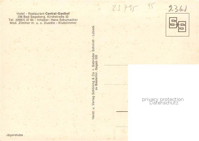 73569331 Bad Segeberg Hotel-Restaurant Central-Gasthof postalisch nicht gelaufen Erhaltung siehe scans [PaolaD17] KatCode: 11110001060005