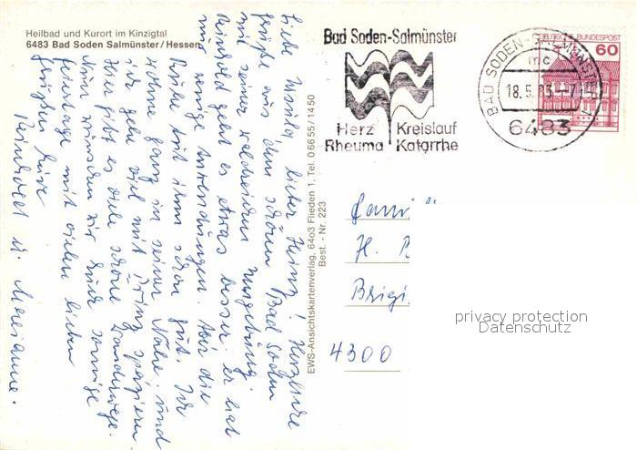 72744950 alte Postkarte Bad Soden-Salmuenster Blick vom Wassergarten Wasserspiele Kurstadt im Kinzigtal postalisch gelaufen Erhaltung siehe scans [FriedD77] KatCode: 11110006435002