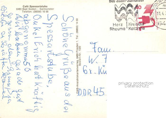 73844649 alte Postkarte Bad Soden-Salmuenster Cafe Spessartstube Gastraeume Terrasse postalisch gelaufen Erhaltung siehe scans [FriedD77] KatCode: 11110006435002