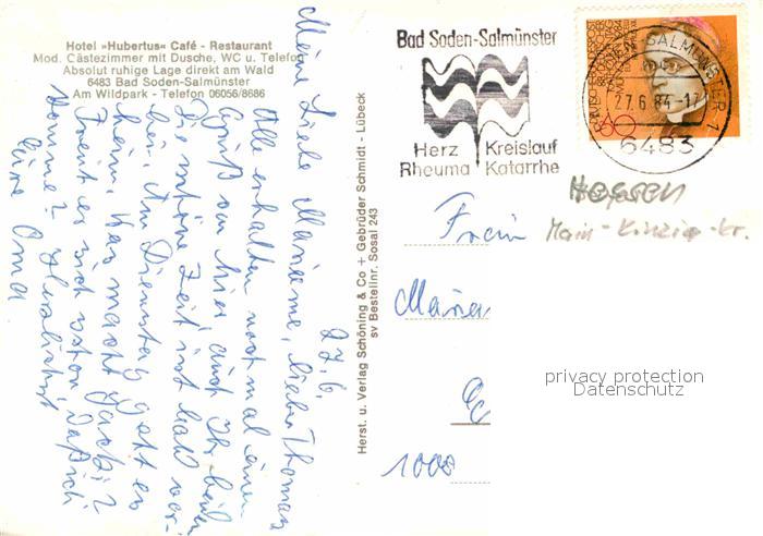 72886615 alte Postkarte Bad Soden-Salmuenster Hotel Hubertus Cafe Restaurant postalisch gelaufen Erhaltung siehe scans [FriedD77] KatCode: 11110006435002