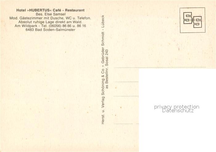73615115 Bad Soden-Salmuenster Hotel Hubertus Cafe Restaurant postalisch nicht gelaufen Erhaltung siehe scans [WerneD78] KatCode: 11110006435002